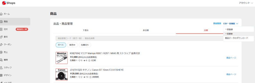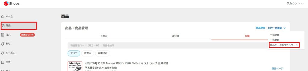 メルカリショップスから商品情報をダウンロードし、