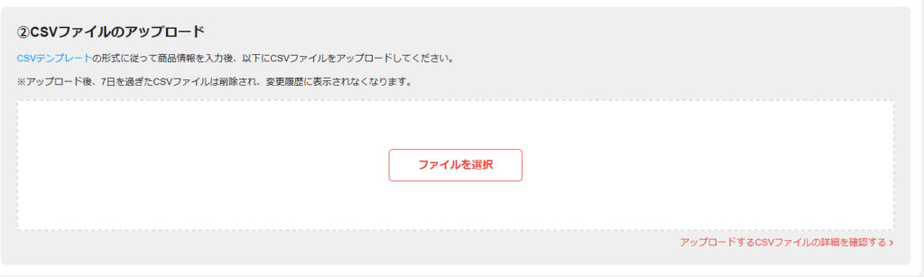3.”CSVファイルのアップロード”に先ほどダウンロードしたCSVファイルを入れる