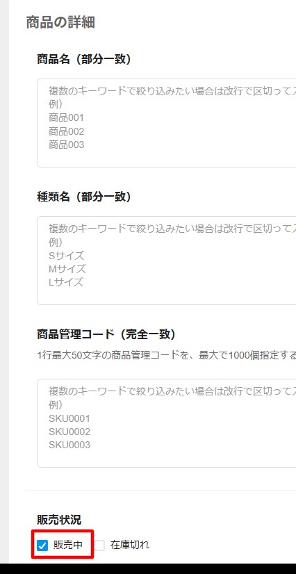 3.中盤にある”販売状況”の「販売中」にチェックを入れる