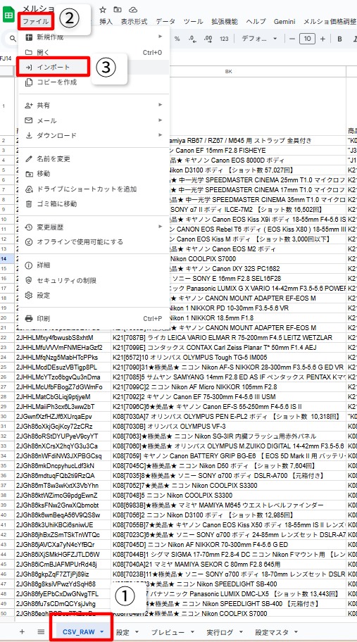 1.メルショ価格調整(スプレッドシート)を開いて「CSV_RAW」シートを選択