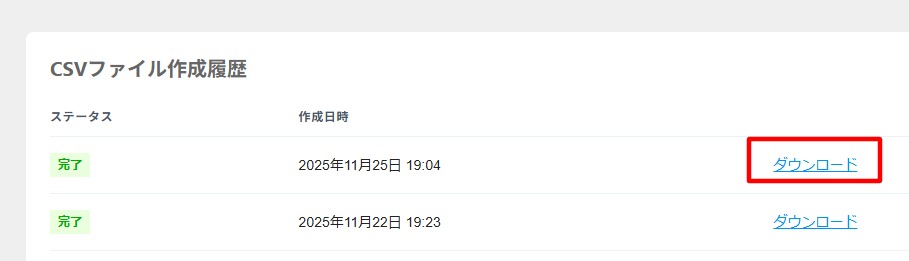 5.一番下の”CSVファイル作成履歴”で”処理中”から”完了”になるまで待ち、ダウンロードをクリック