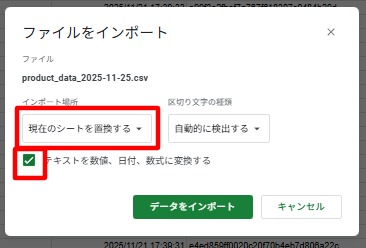 4.「現在のシートを置換する」、”テキストを数値、日付、数式に変換する”にチェックを入れてインポートしてください。