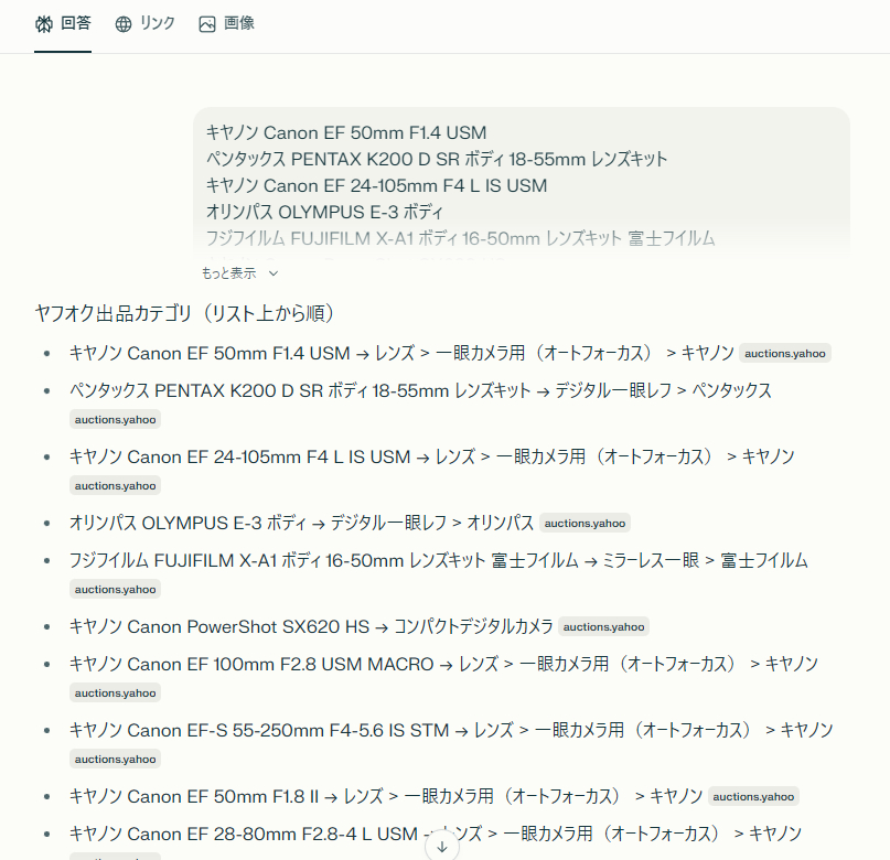 こちらをクリック(perplexity.ai)して商品リスト(出品リストシートのD列)をそのまま送ってください。