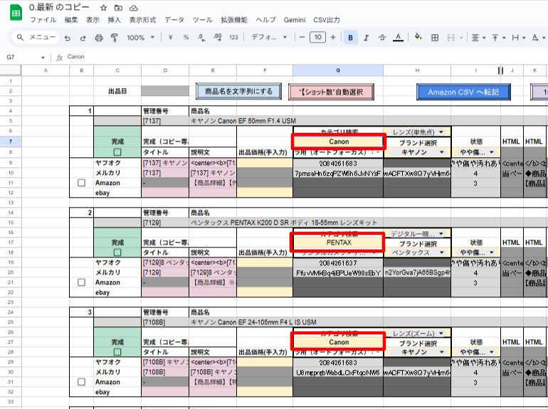 2.作成シートにてカテゴリ検索にメーカー名やカテゴリの中に含まれるワードを入力する(1商品目はG7)