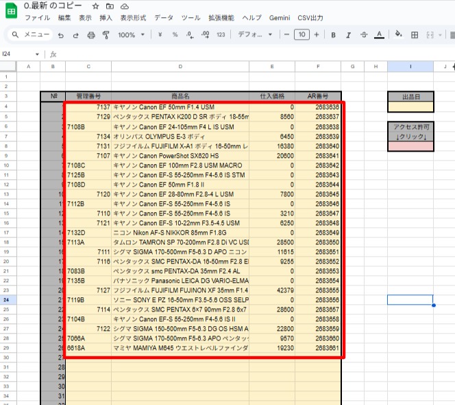 1”業務依頼報告書”にて共有されたCSVファイルを開いて、「0.最新」 の出品リストシートにコピーする